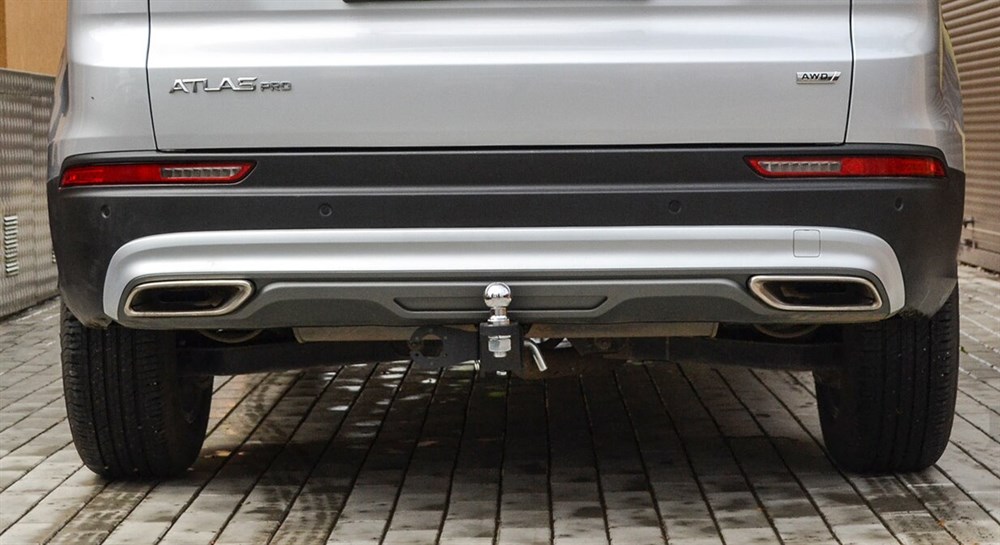 Фаркоп под квадрат или, как его еще называют, американский фаркоп на Джили Атлас Про, очень удобен в эксплуатации, благодаря быстросъемной части, при этом рама и кронштейн фаркопа скрыты за задним бампером и не выступают за габариты автомобиля. Фаркоп устанавливается в выполненные автопроизводителем отверстия (без дополнительного сверления силовых элементов). Выход из рамы представляет собой толстостенную трубу с квадратным сечением и сквозным отверстием для стопорного пальца тягово-сцепного устройства. Диаметр шара — 50 мм.
